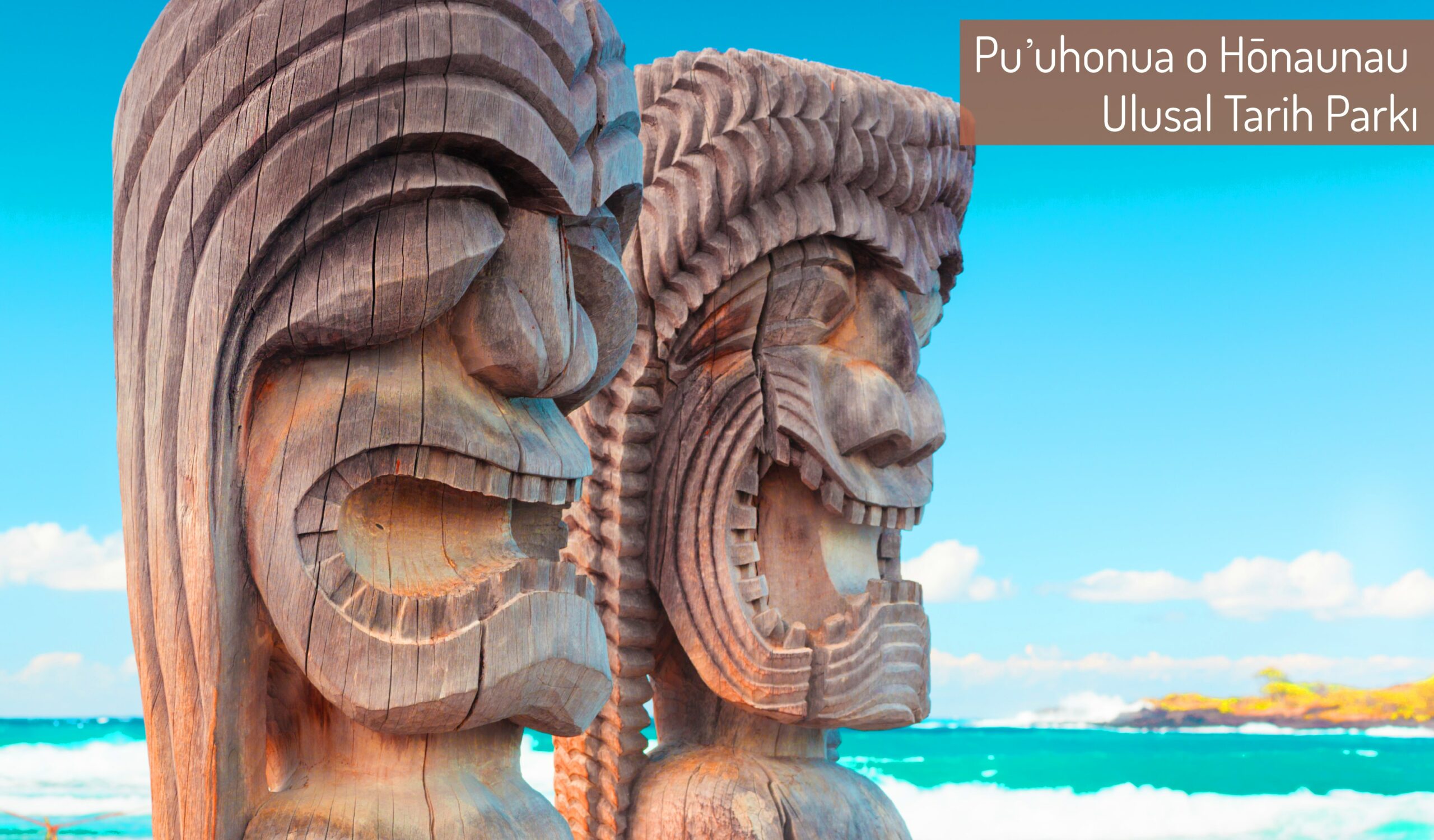 Hawaii’deki Puʻuhonua o Hōnaunau Ulusal Tarih Parkı… Telaffuzu biraz zor olan bu yerde dev heykeller bulunuyor ve görselde gördüğünüz iki Ki’i bu parkta… “Ki’i” bir Hawaii kelimesi ve insan şekline sahip ahşap heykel anlamına geliyor.