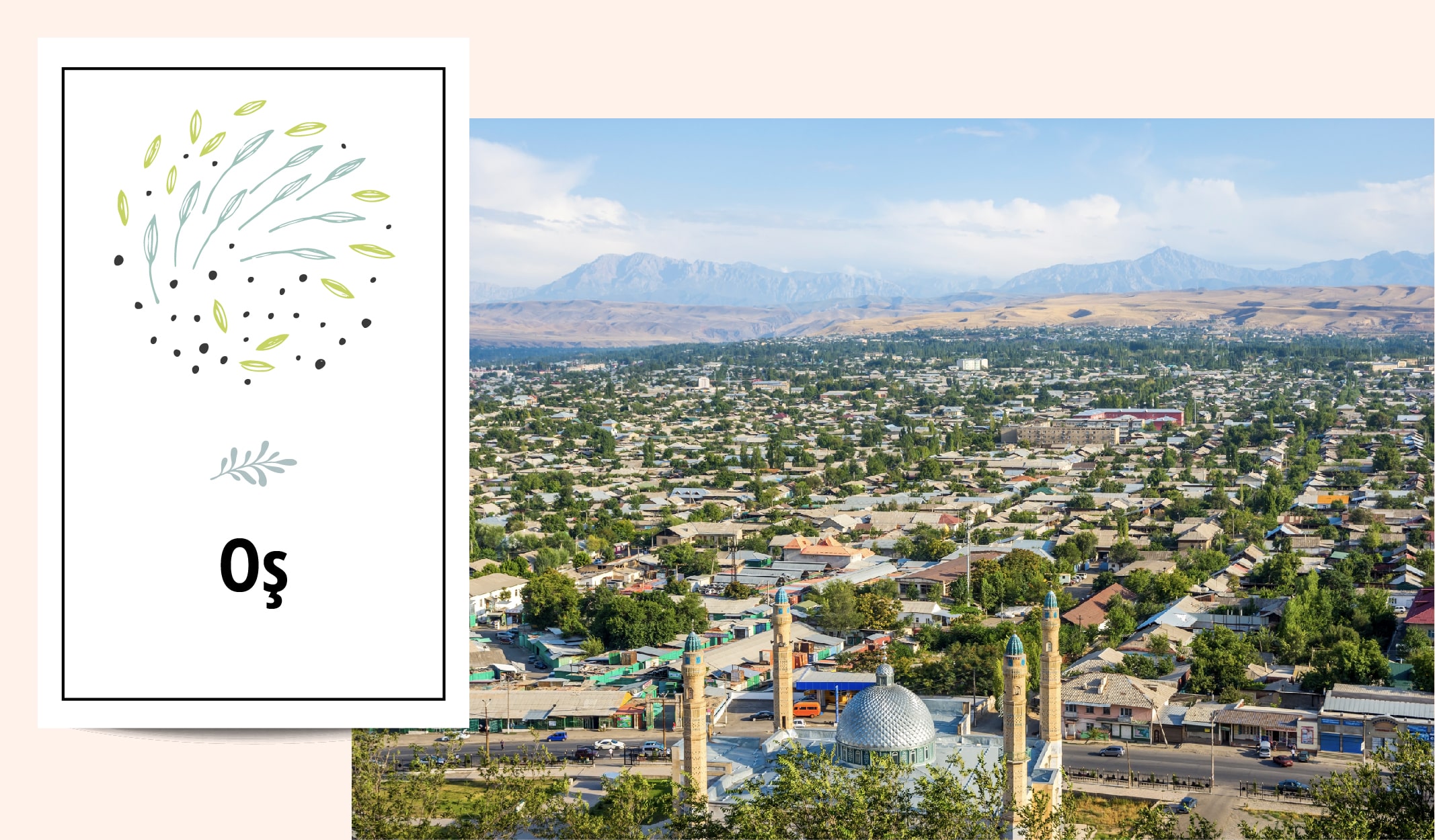 Ülkenin güneybatısında en büyük ikinci şehir yer alıyor. Geçmişi antik çağlara dek uzanan ve tarihi İpek Yolu üzerinde bulunan Oş, güneyin başkenti olarak biliniyor. Burası hem Türk tarihi açısından önemli, hem de İslam dini bakımından kutsal sayılan bir kent. Yukarıdaki fotoğrafta da gördüğünüz üzere şehri çevreleyen Süleyman Dağı ve ortadaki Süleyman Dağı Camii yılın her mevsiminde farklı ülkelerden ziyaretçilerini ağırlıyor. Oş‘un ekonomi, kültür, sanat ve eğitim alanlarında da güneyin en önemli şehri olduğunu söyleyebiliriz.