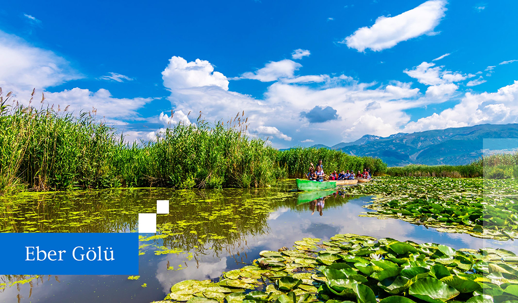 Eber Gölü ise yüzeyini kaplayan kamışlar nedeniyle göl değil de çayırlık gibi görünen tam bir doğa harikası. Turna ve sazan balıklarının yetiştiği, göçmen su kuşlarının rağbet ettiği Eber’deki onlarca yüzen adacık da gölü diğerlerinden oldukça farklı kılıyor.