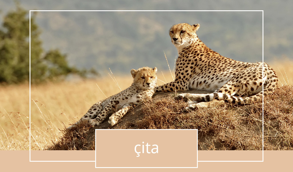 Panthera cinsi yani büyük kedigillerin dışında kalan ama yine de bizlerin algısına göre büyük kedi olarak nitelendirilebilen canlılara geldi sıra. Bunlardan biri küçük yuvarlak kafası, koyu sarı üstüne siyah benekli kürkü, dar ve uzun bacaklarıyla öne çıkan çitadır. Hızlı koşmasıyla ünlü olan çita, sıfırdan 108 kilometre hıza 3,1 saniyede erişir ve bu hızla aldığı mesafe 450 metrenin üstüne çıktığında vücut ısısı 46 derecenin üstüne çıkarak beyni için risk oluşturur. Bu nedenle çitanın av peşindeki hızlı koşusu bir dakikanın üzerine çıkmaz.
