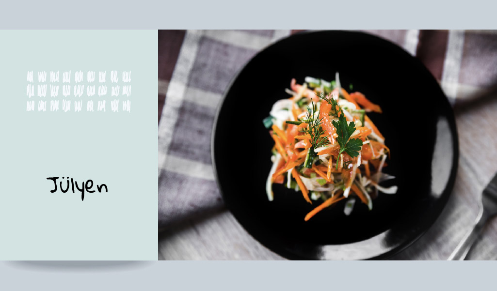 Her çeşit sebze veya meyvede uygulayabileceğiniz jülyen doğrama, malzemelerin 3-4 santimetre uzunlukta ve aynı kalınlıkta kesilmelerine deniyor.