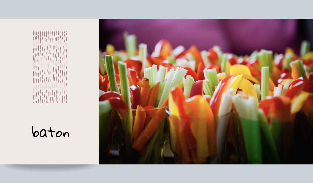 Özellikle ikramlık sebzeler için uygulayabileceğiniz baton doğrama ise yarım cm. kalınlığında 4-6 santimetre uzunluğunda kare prizma şekillere karşılık geliyor.