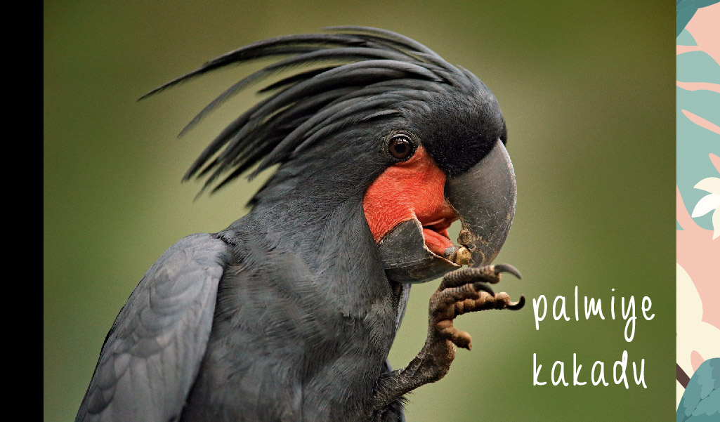 Adını, palmiyeyi andıran tepe tüylerinden alan bu kakadu ise oldukça iri yapılı ve en iri gagalı papağandır. Ve daha ilginç özelliği ise yüzündeki kırmızı bölgenin heyecanlandığı zaman mavi renge dönüşmesidir. Palmiye kakadular da ailenin diğer türleri gibi farklı sesler çıkarabilir, çok iyi ıslık çalabilir ve büyük çığlıklar atabilirler.