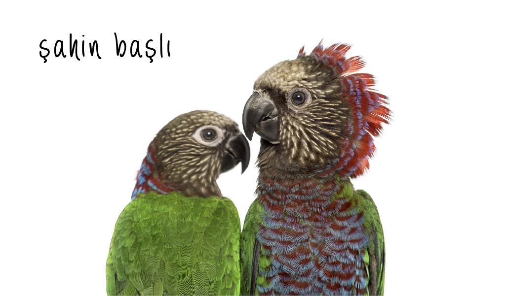 Fotoğrafta gördüğünüz papağanlar, adı üstünde, kafaları bir şahini andırdığı için ülkemizde de şahin başlı papağan olarak bilinirler. Anavatanı Güney Amerika olan şahin başlılar, boyun kısmına kadar uzanan mavi ve kırmızı renkteki tüylerini tehlike hissettikleri anda dikleştirirler. Son derece sosyal olan bu türün ortalama yaşam süresi 40 yıldır.