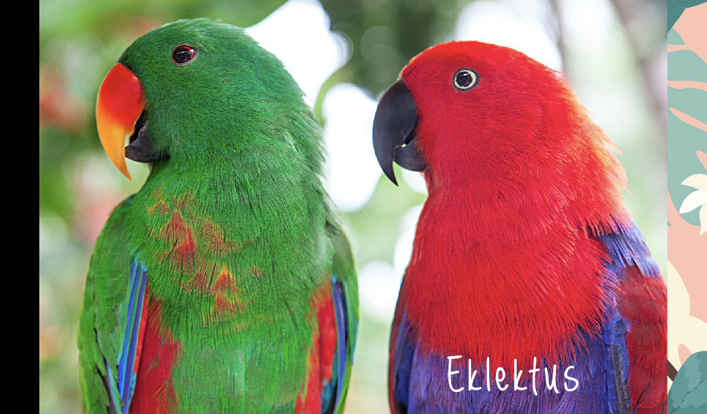 Ortalama yaşam süreleri 30 yıl olan eklektus papağanları ise Güney Pasifik’e özgü bir türdür. Sosyal, meraklı ve uyum sağlama yeteneği gelişmiş olan bu papağanlar iyi eğitildikleri takdirde evlerde nispeten kolay bakılabilen türlerdendir. Elbette diğer papağanlar gibi yaşam alanlarının geniş tutulması ve beslenmeleri konusunda oldukça titiz olunması gerekmektedir.