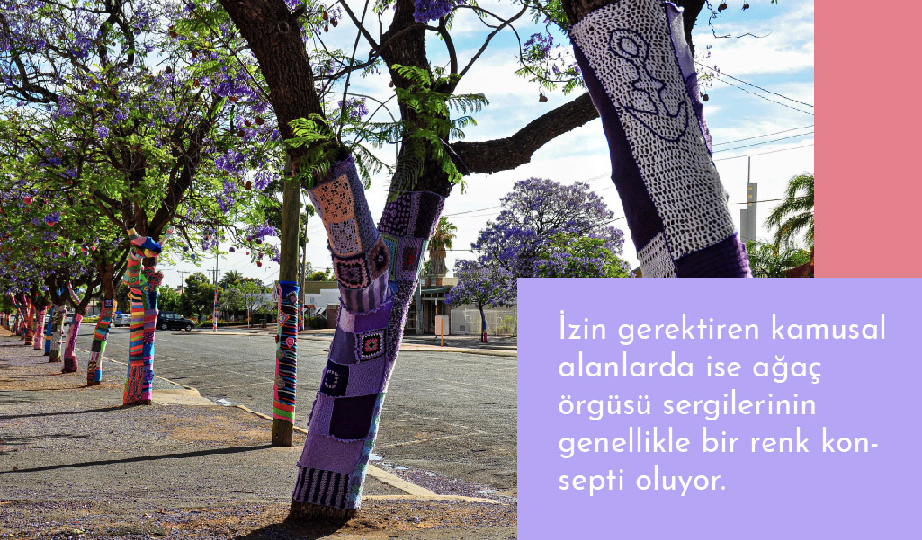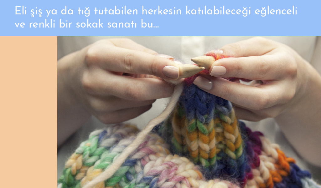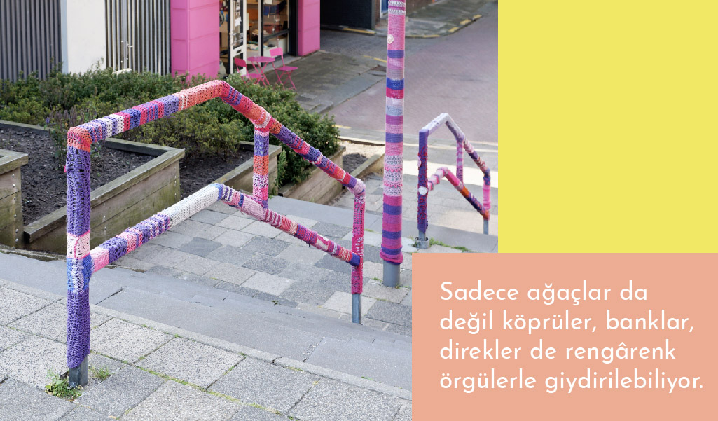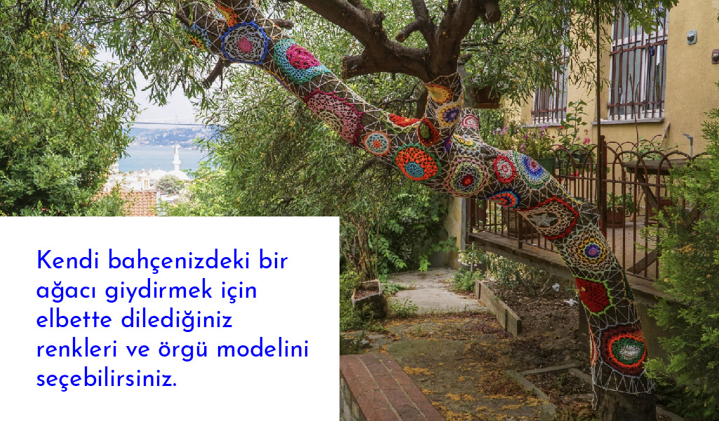 Sokak sanatı olarak yurt dışında ortaya çıkan nesneleri örgüyle giydirme etkinliği ülkemizin büyük şehirlerinde de kendini göstermeye başladı. “Yarn bombing” veya “urban knitting” gibi isimlerle tanınan bu sanat çoğunlukla ağaçlar üzerinde uygulanıyor. Örneklerini görmek ve hakkında biraz daha bilgi edinmek için lütfen sayfayı kaydırmaya devam edin.