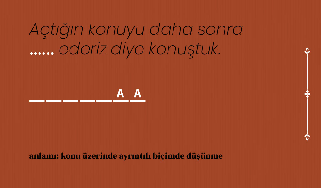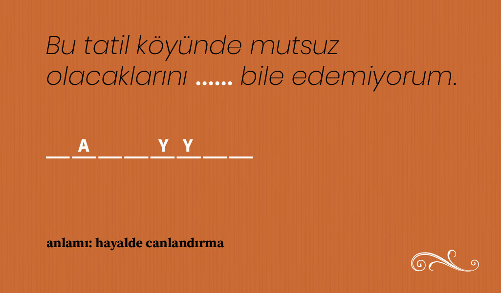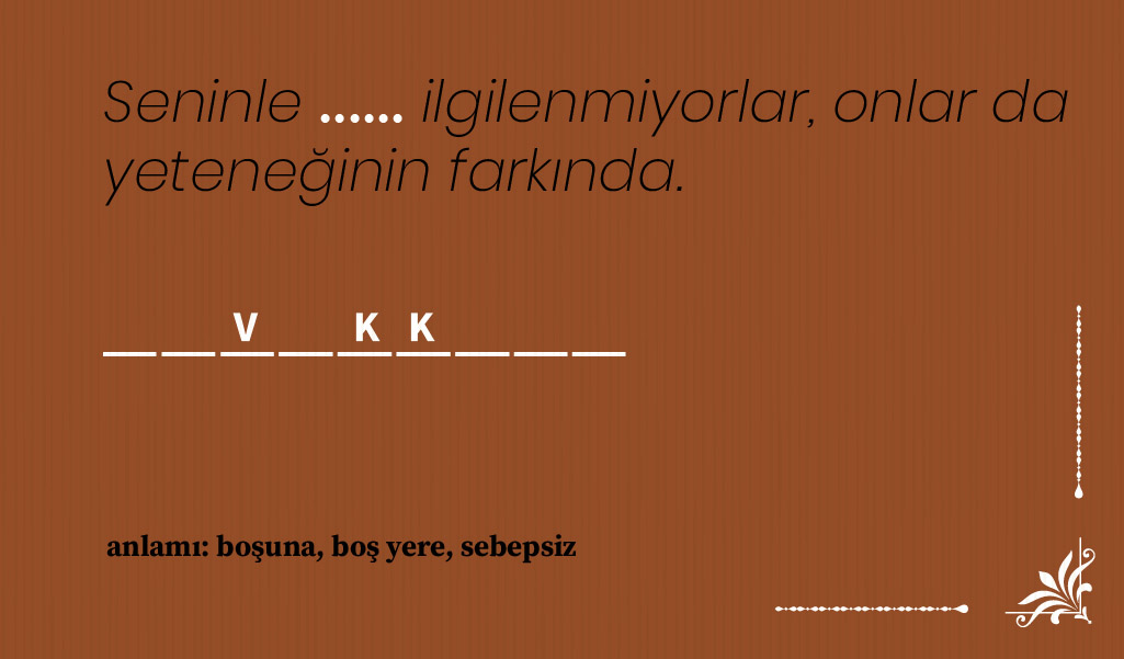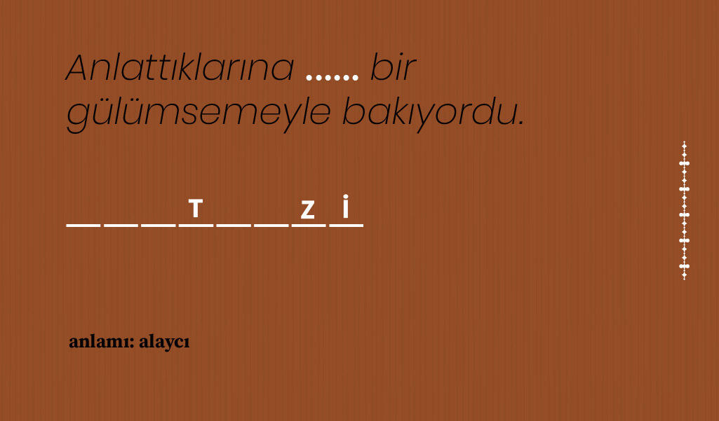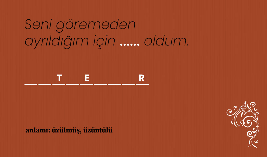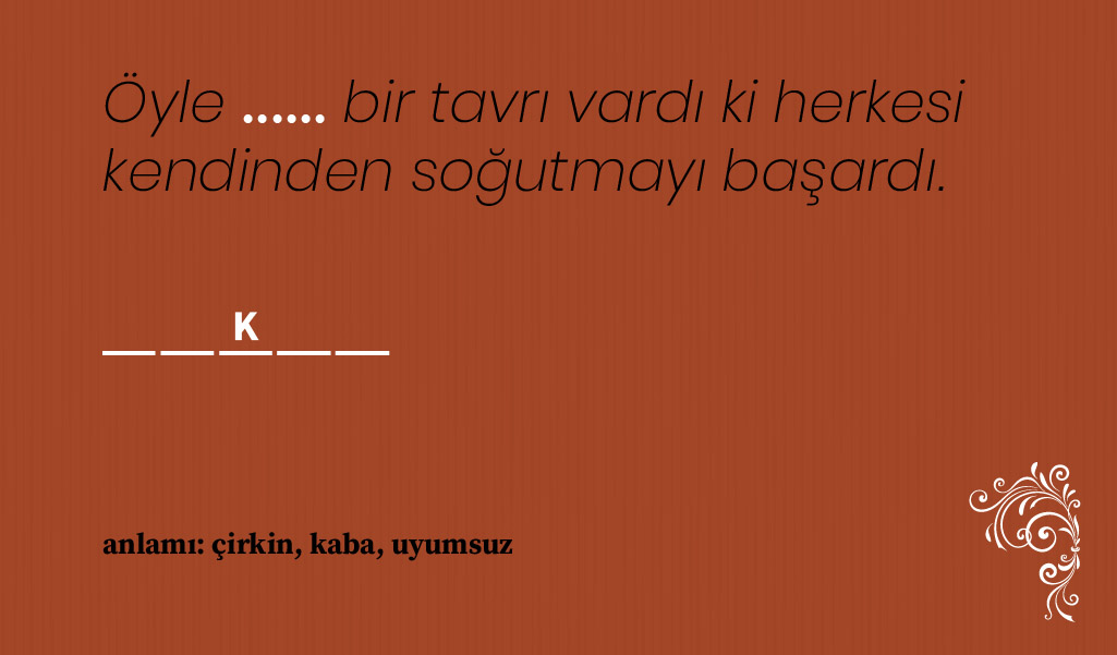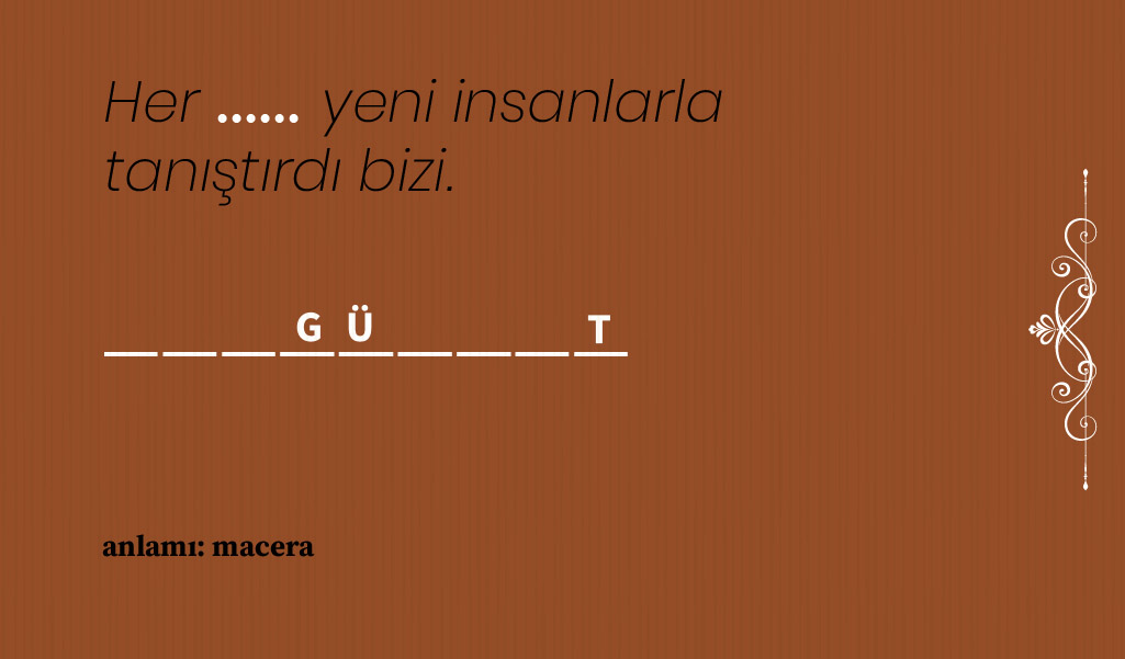 Bazı Osmanlıca kelimeler var ki anlam ve kullanım biçimlerine hakim olmak için konunun ilgilisi olmak gerekiyor, hele de yaşı 20’lerde seyredenlerin o kelimeleri bulup çıkarması gerçekten zor. Biz de bulmacamızda nostaljik kelimeler sorduk ama büyük oranda kullanımda olan, hiç değilse edebi eserlerde sıkça yer verilen sözcüklerden seçmeye gayret ettik. Hatta her kelimenin harf sayısı ile birkaç harfini belirtip, siz zorlanmayın diye bulmanız gereken kelimenin anlamını bile söyledik. Şimdi sıra sizde! 🙂 Soru şu: Cümle içindeki boşluğa hangi nostaljik kelime gelmeli? Cevaplar her zamanki gibi sayfanın en altında.