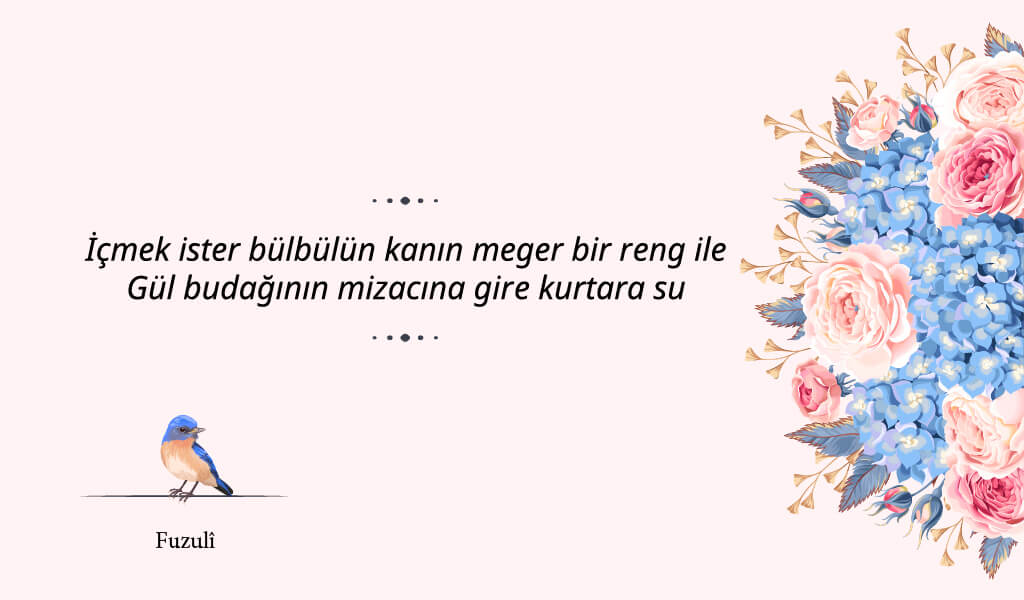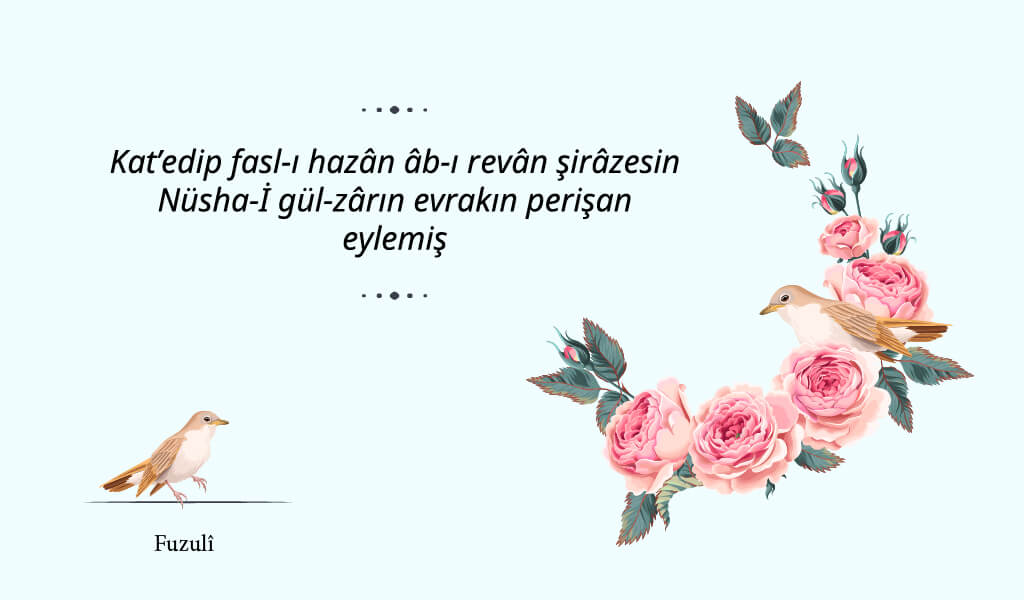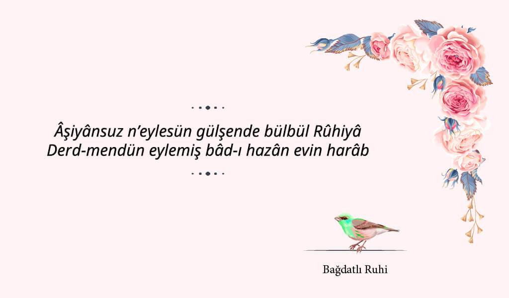 “Ey Ruhî yuvasız kalan bülbül gül bahçesinde ne yapsın, dertli bülbülün evini hazan rüzgârı mahvetmiş.”