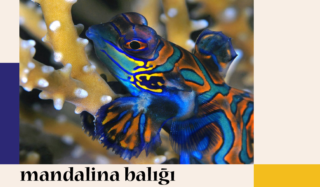 Alabildiğine parlak ve göz alıcı renkleriyle ünlü minik mandalina balığının ana vatanı Batı Pasifik’tir. Resiflerin arasında büyük bir grup olarak yüzen mandalina balığı okyanusun en görkemli fotoğraflarından birini verir. Vücudunda turkuaz, açık mavi ve turuncu renkler içeren sanatsal desenler taşır.