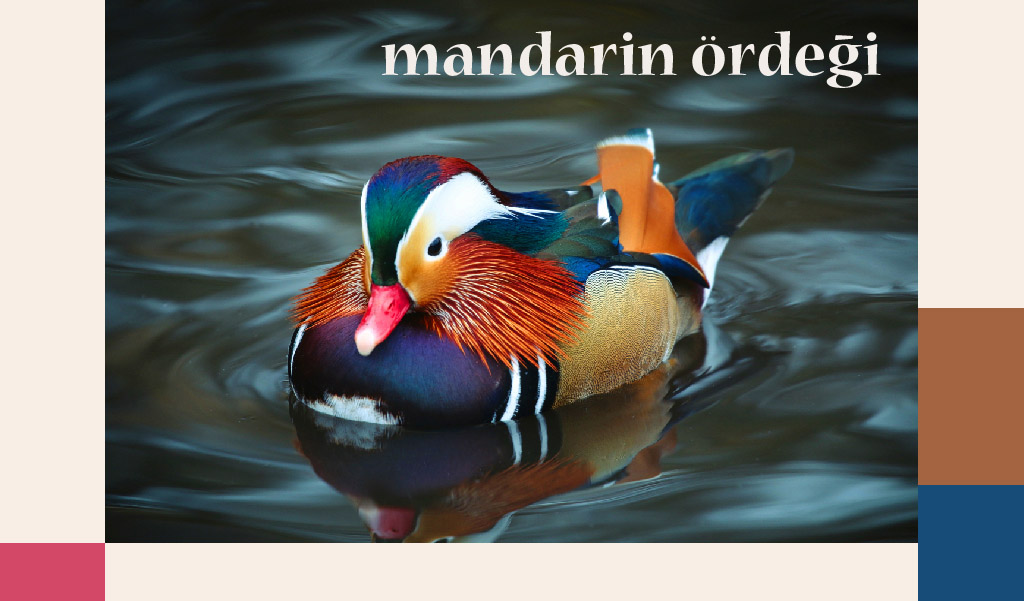 Mandarin ördeği ise toprak tonlarının şeritler halinde kullanıldığı bir tablo gibidir, tabii mor, parlak lacivert, zümrüt yeşili de yer yer o tonlara eşlik eder. Anavatanı Uzakdoğu’dur ve o bölgelerde sevgiyi, sadakati temsil ettiği için düğün mekânları mandarin ördeklerinin renkleriyle süslenir. Belirtmek isteriz ki, erkekleri gösterişli ve göz alıcı renklere sahipken, dişileri oldukça sade bir görünümdedir.