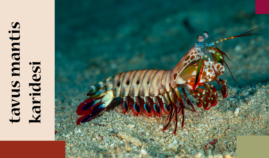 Bir çizgi film karakterinden farksız olan tavus mantis karidesi minik boyutlarına rağmen (ortalama 10 cm.) sıkı bir dövüşçüdür hatta pençe darbesiyle akvaryum camını tuz buz edecek bir güce sahip olduğu söylenir. Hint ve Pasifik Okyanusu’nda bulunan bu canlıların bedenleri kahverengi ayakları üstünde bir gökkuşağı taşırcasına dikkat çekicidir.