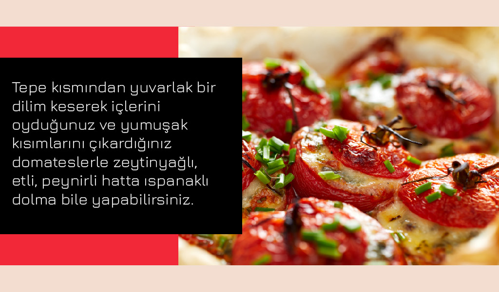 Amerika kıtasından dünyaya yayılan, tarihte sarı türü altın elma, kırmızısı aşk elması diye tanımlanan, zehirli olduğu düşünüldüğü için uzun süre yemek değil süs bitkisi olarak yetiştirilen domates, günümüz dünyasının en kıymetli, en faydalı ve lezzetli besinleri arasında yer alıyor. Günün tüm öğünlerinde çiğ olarak veya farklı şekillerde pişirerek yiyebildiğimiz domatesin hangi yemeklerde kullanılabildiğini aşağıda görebilirsiniz.
