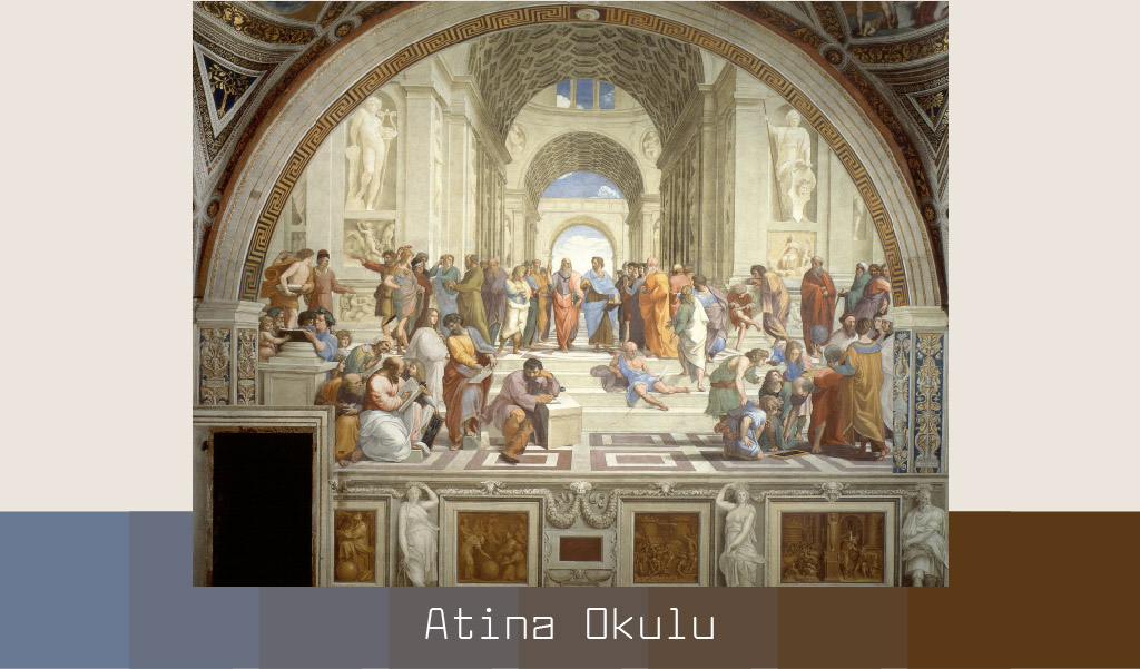 Atina Okulu isimli resim aslında İtalyan ressam Raffaello Sanzio tarafından 1509-1511 yılları arasında yapılan bir fresktir. Sanatçı kendi çağında düşüncenin körelmeye yüz tuttuğunu düşünerek filozof ve bilim insanlarından oluşan bu resmi çizmiştir. Tüm figürlerin kimi temsil ettiği bilinmemekle birlikte birçoğu çözülebilmiştir. Resmin tam ortasında kalan iki figür Aristo ve Platon’dur. Diğer figürler arasında Öklid, Pisagor, Epikür, Diyojen, Strabon gibi ünlü düşünürler bulunmaktadır.