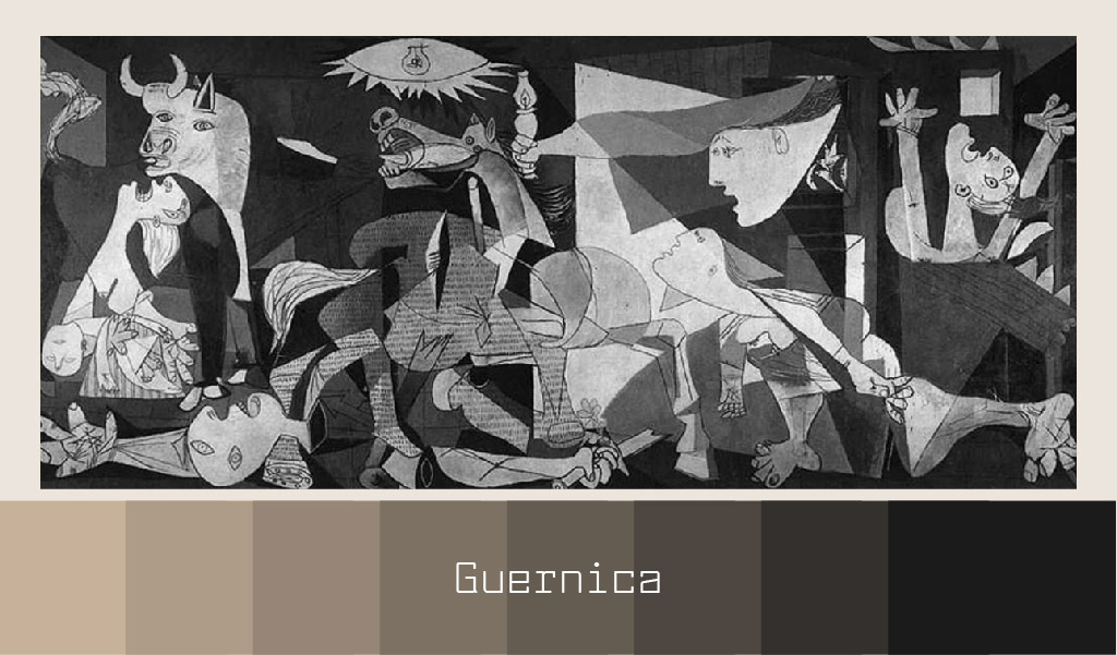İspanyol ressam Picasso 1937 yılında yaptığı resimde, İspanya İç Savaşı esnasında Nazilerin yönetimindeki Almanya’ya ait bombardıman uçaklarının İspanya’daki Guernica şehrini bombalamasını resmetmiştir. 26 Nisan 1937’de gerçekleşen bombalamanın yarattığı trajediyi korku dolu insanlar, acı çeken hayvanlar, yıkılan binalar eşliğinde tasvir etmiştir. Savaşı ölüm ve cansızlıkla eşleyerek resmi renklendirmemiş siyah beyaz olarak üretmiştir.