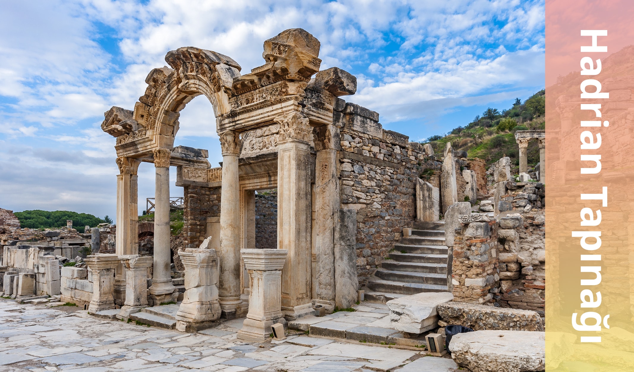 MS 117 yılında tahta geçen Hadrianus adına yapılan tapınağın alınlığında Efes’in kuruluş öyküsünü anlatan kabartmalar bulunuyor. Herakles’in Theseus’la savaşı, Kral Androklos’un yaban domuzunu öldürüşü, Apollon, Artemis, Dionysos, Afrodit, Ares ve diğerleri… Fakat alınlığın orijinalini Efes Müzesi’nde görebilirsiniz. Tapınağın üzerindeki ise MS 4. yüzyıldaki restorasyon sırasında konulmuş.