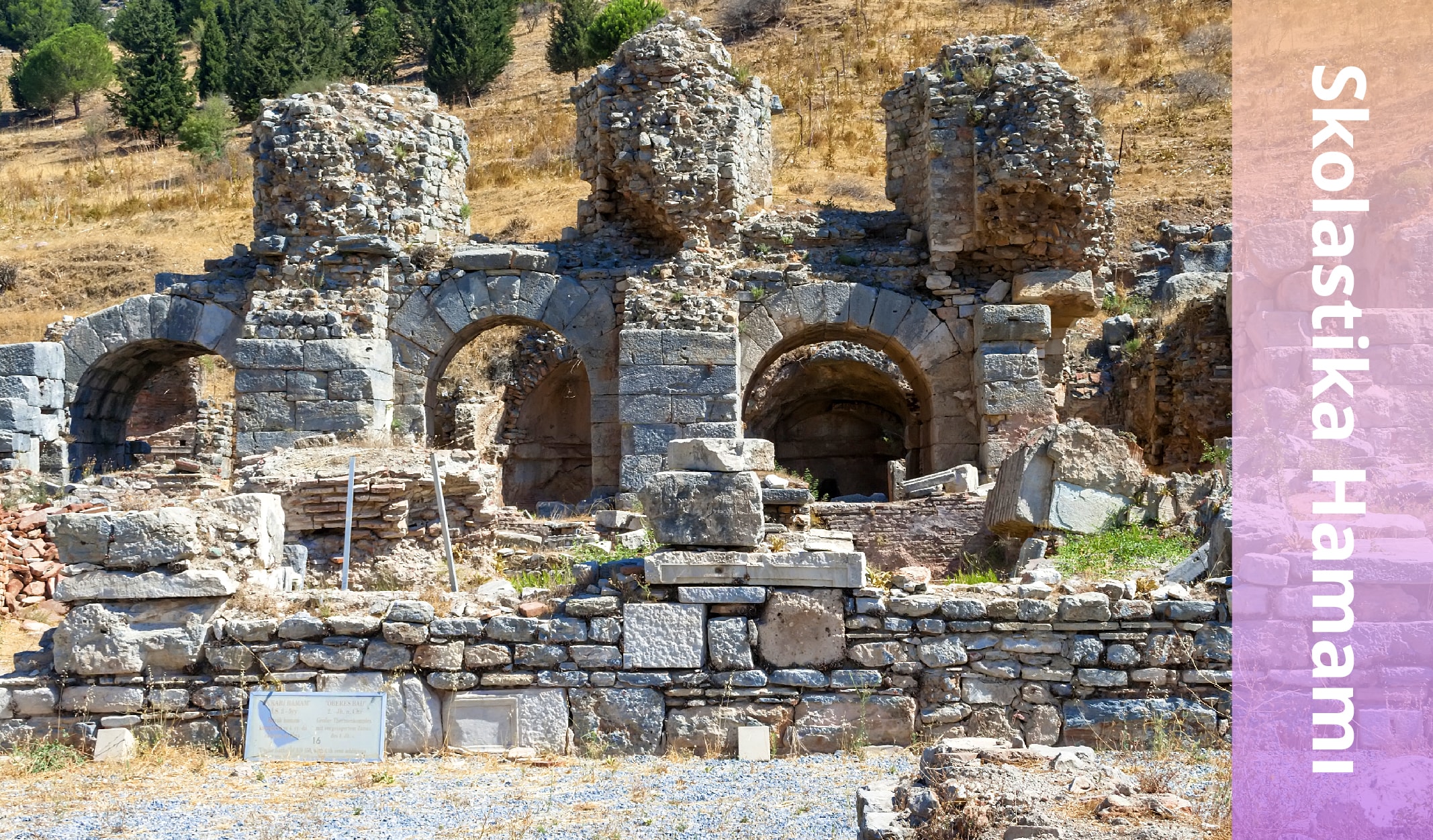 Kuretler Caddesi üzerindeki üç katlı hamam MS 1. yüzyılın sonlarında inşa edilmiş ve restorasyonu Skolastika isminde bir kadın tarafından MS 400 yıllarında yaptırılmış.