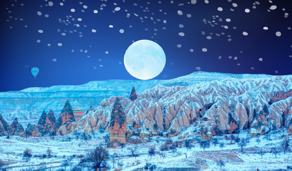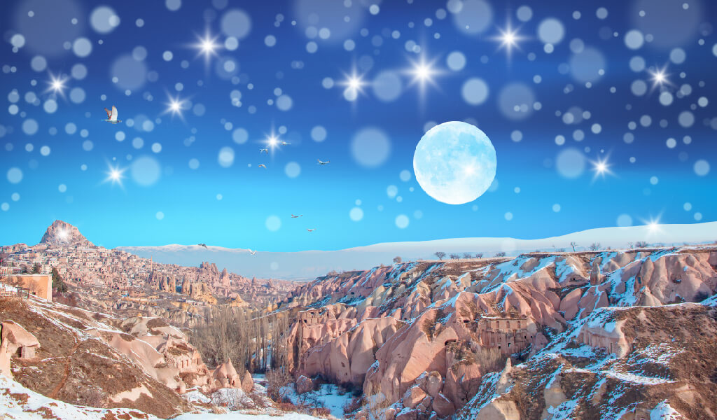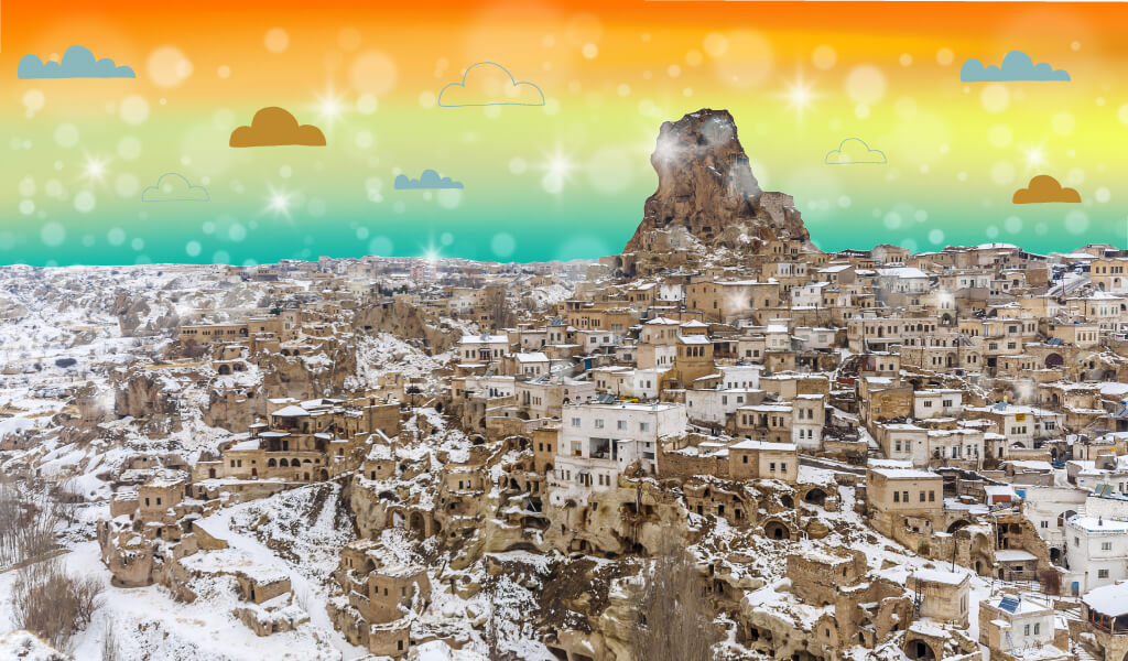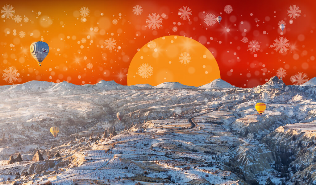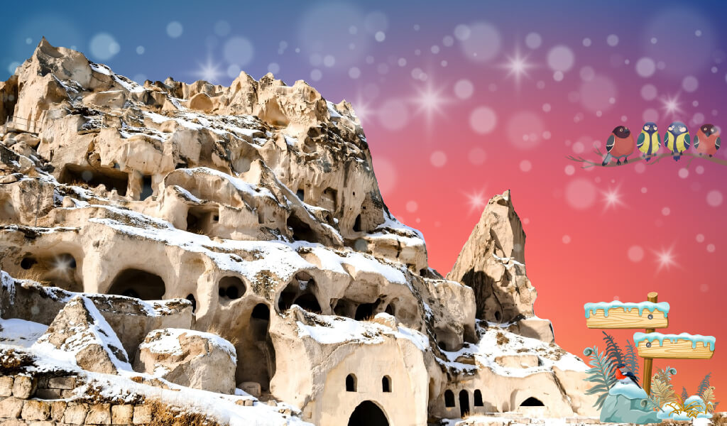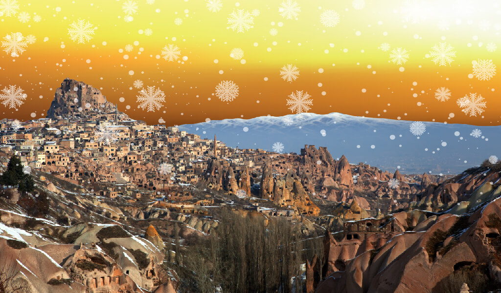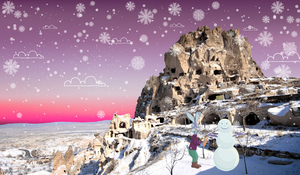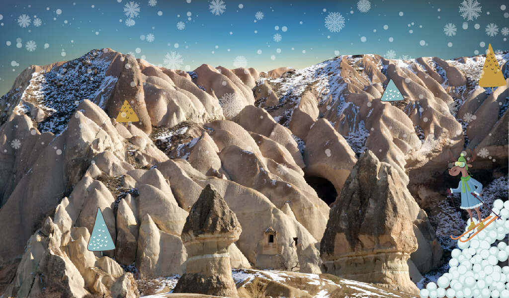 Bizi zaman makinasına ihtiyaç duymaksızın zamandan koparabilen sayılı yerlerden biridir Kapadokya… Onun olağanüstü coğrafyasını bu kez de bembeyaz kar örtüsüyle bir araya getiriyor ve sizi bir süreliğine zamanda kaybolmaya davet ediyoruz.