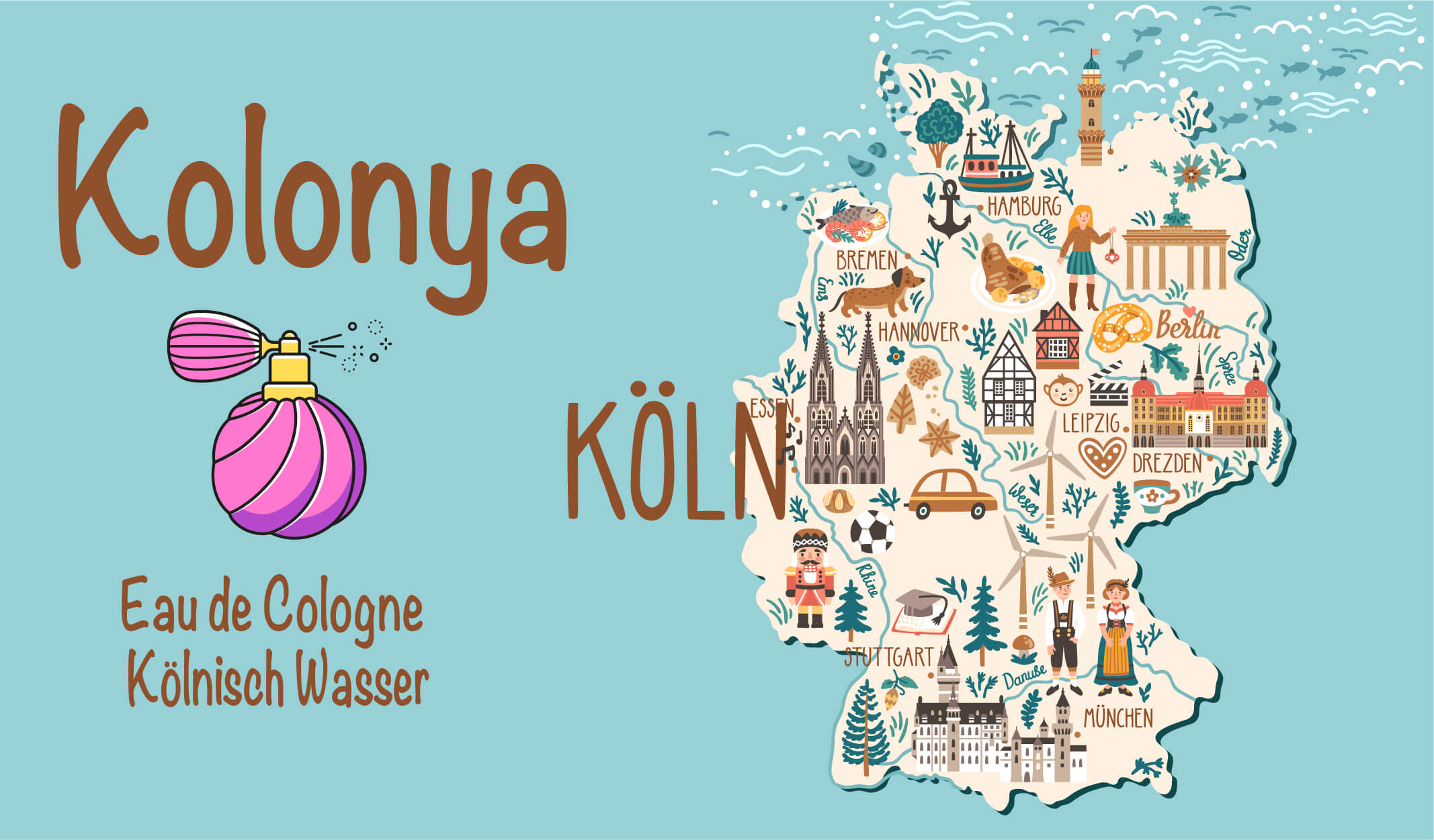 Kolonya, ismini ilk kez üretildiği Köln şehrinden alır ve İngilizce’de “Eau de Cologne”, Almanca’da “Kölnisch Wasser” yani “Köln Suyu” olarak anılır.