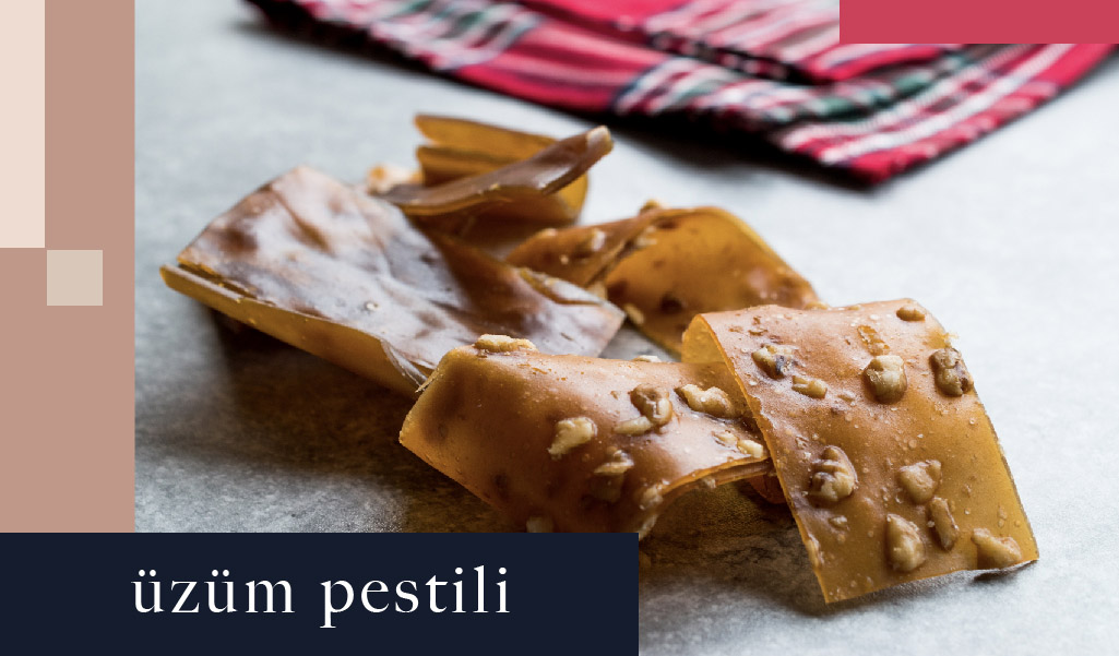 Yaz meyvesi olan üzümün kışa saklanması için uygulanan en iyi yöntemlerinden biri pestil hâline getirmektir. Kayısıdan, duttan, incirden yapılabildiği gibi üzümden de yapılabilen yaprak yaprak pestillerin içine kurutulmadan önce isteğe göre fındık, ceviz ya da badem de eklenebilir.