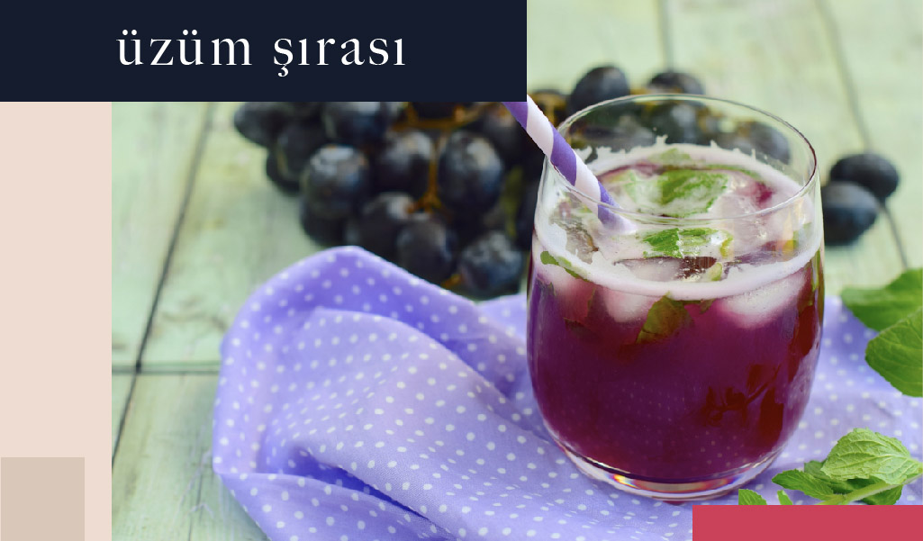 Üzümü kurutabilir, kaynatabilir, özünü çıkararak şifa bulabilirsiniz. Ama en lezzetli ve keyifli hallerinden biri tam mevsiminde suyunu sıkarak içmektir. Bir de genellikle kuru üzümlerden yapılan üzüm şırası vardır ki et yemeklerinin yanında afiyetle içebileceğiniz bir lezzettir.